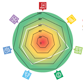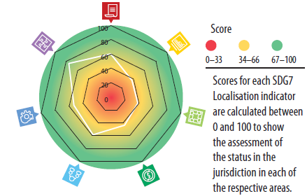 The main spider diagram of the SDG7 Localisation Snapshot presents the results for all seven SDG7 Localisation indicators at once. The diagram provides a visual picture of how a jurisdiction performs in each of these areas based on the overall nominal score (from 0 to 100) calculated for each indicator: the farther the score is from the maximum 100 points, the more room there is for improvements in this particular area of the SDG7 localisation process.