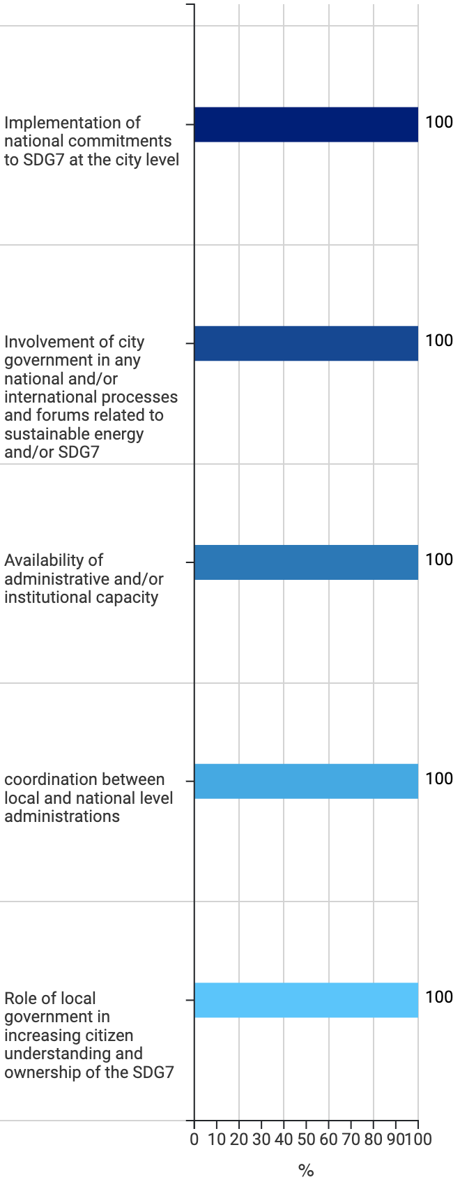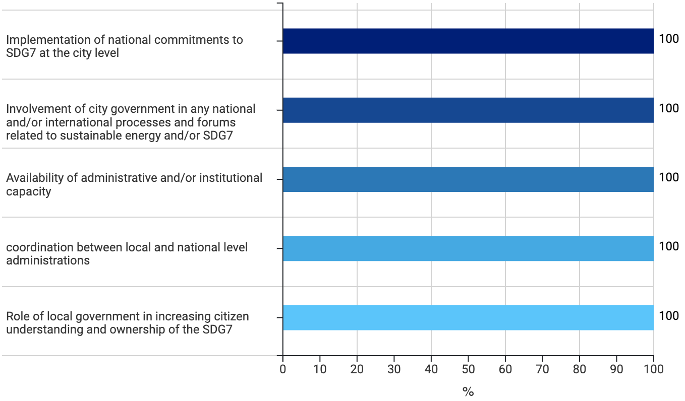 This figure above presents an example of results for SDG7 commitments and institutional capacity. The aim of this figure is to assess the work that the local government is doing in collaboration with the national government in relation to SDG7 implementation, the alignment between national and local commitments on SDG7 and any existing coordination mechanisms between different levels of governance, which are crucial for effective implementation of the actions toward achievement of SDG7. The city can lead by example and set its own targets and commitments on SDG7 (which might be even more ambitious than the national ones) or implement targets similar to the ones set at the national level. In any case, the effectiveness of SDGs localisation increases if there are mechanisms for coordination and communication regarding SDG-related efforts at the national and local levels.