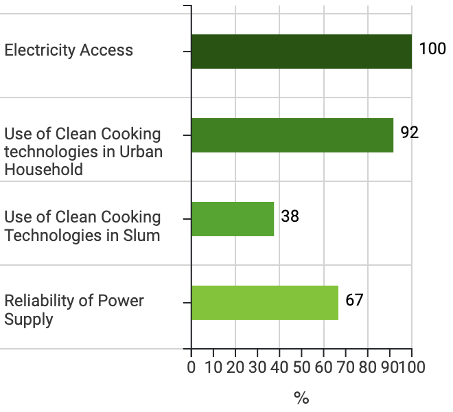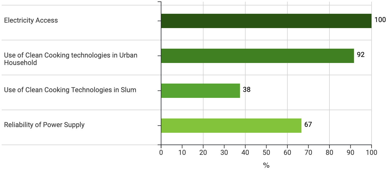 The figure demonstrating the example of results on energy access covers three main aspects of this area: electricity access, reliability of power supply, and use of clean cooking methods in urban household as well as slums and informal settlements.
