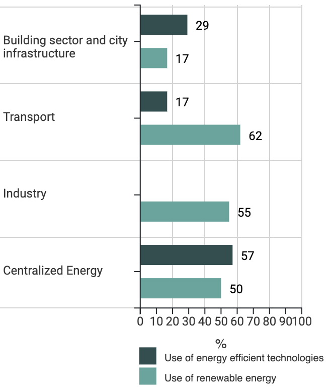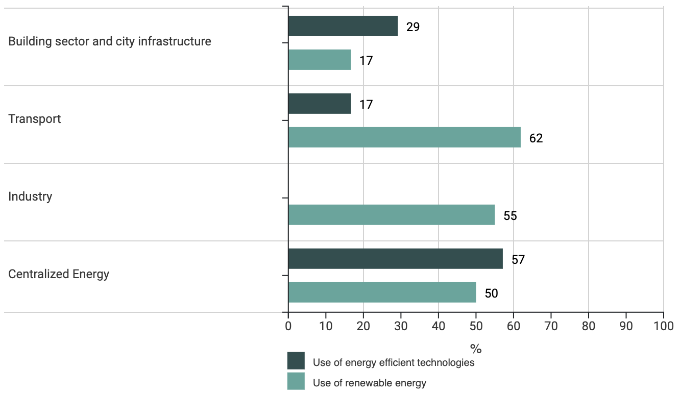 The scores resulting from city’s self-assessment regarding utilisation of energy efficient and renewable energy technologies are presented for four end-use sectors: buildings and infrastructure, transport, industry, and centralised energy. The results in the figure above show that renewable energy is widely used in the transport sector and centralised energy, but there is still room for improvement in buildings and infrastructure, as well as in the industry sector. The level of utilisation of energy efficient technologies is moderate across all sectors.